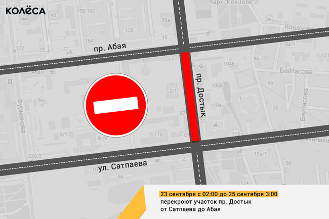 В субботу и воскресенье в Алматы ограничат движение автомобилей на участке проспекта Достык. Проезд закроют от ул. Сатпаева до пр. Абая в 2:00 23 сентября и откроют в 3:00 ночи 25 сентября. Водителям следует заранее корректировать свои маршруты.