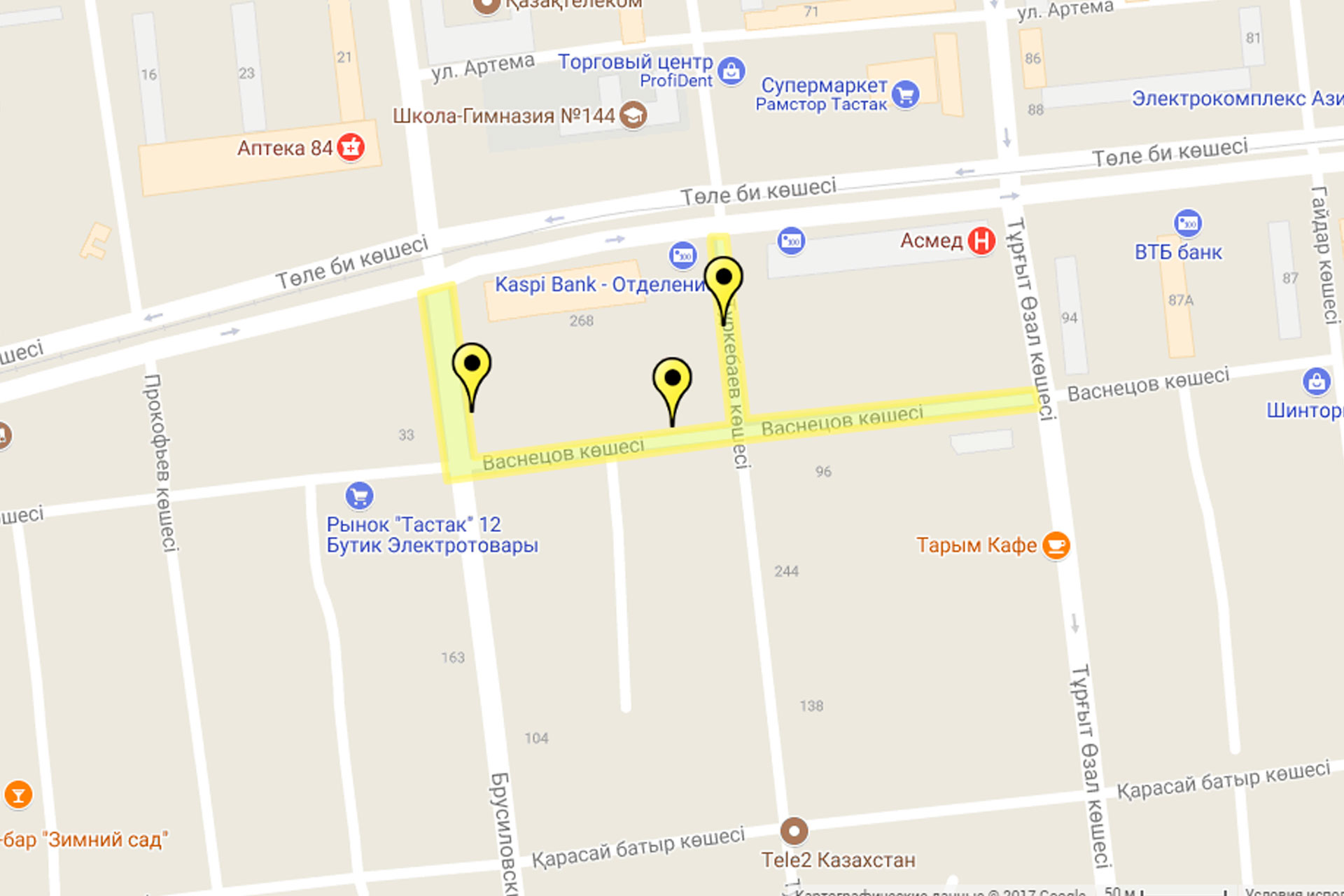 Отныне оставлять автомобили за 100 тенге в час придётся на отрезке улицы Васнецова между Тургута Озала и Брусиловского, а также на самой Брусиловского и Туркебаева — от Васнецова до Толе би. Новая зона платной парковки оборудована тремя паркоматами. Время бесплатной парковки на данных участках — с 19:00 до 8:00.