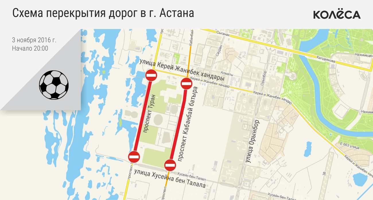 Групповой этап Лиги Европы начнётся в 22:00, но уже с 20:00 будет ограничено движение транспорта по проспектам Кабанбай батыра и Туран, на участке от улицы Керей Жанибек хандары до улицы Хусейна бен Талала. Запрет продолжит действовать до окончания мероприятия. Рекомендуемый маршрут объезда — по улице Орынбор.