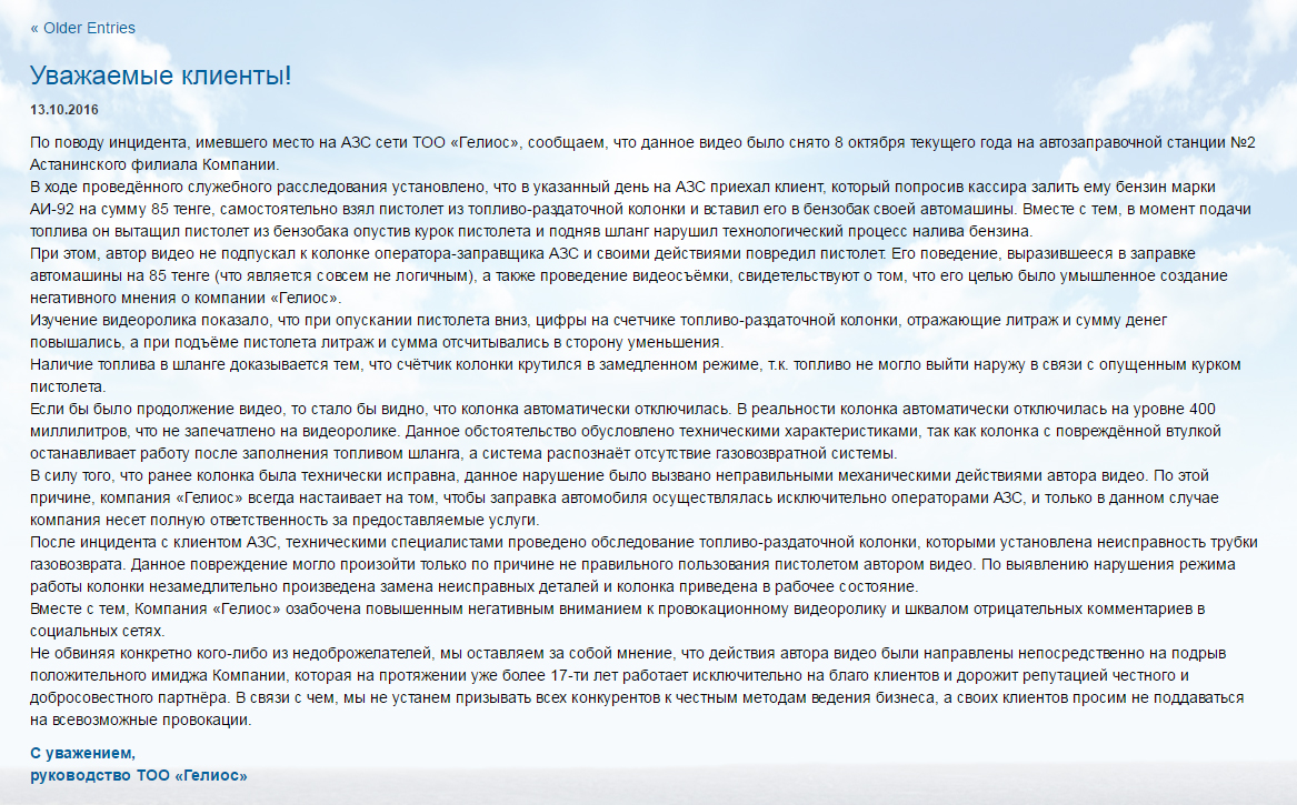 По словам руководства компании, инцидент произошёл 8 октября текущего года в Астане на АЗС № 2, находящейся на пересечении шоссе Алаш и улицы Акжол. В результате внутреннего расследования выяснилось, что автор видео попросил кассира залить ему 92-й бензин на 85 тенге (что странно, т. к. это даже не 1 литр), однако своими действиями нарушил технологический процесс заправки бензина, повредив при этом пистолет.