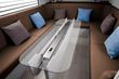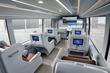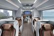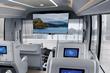 Интерьер бизнес-автобуса условно разделён на три зоны. Это общие пространства для проведения переговоров и отдыха спереди и сзади, тогда как середина салона отведена индивидуальным рабочим местам сотрудников. Имеется система видеоконференц-связи, складной стол, диван и отсеки для хранения офисных принадлежностей и личных вещей сотрудников, точки подключения и зарядки для мобильных устройств. О степени комфорта кресел можно судить по опубликованным фотографиям — они как минимум соответствуют бизнес-классу в самолёте, в них удобно не только работать, но и вздремнуть по надобности. А ведь хороший сон приближает конец трудового дня.