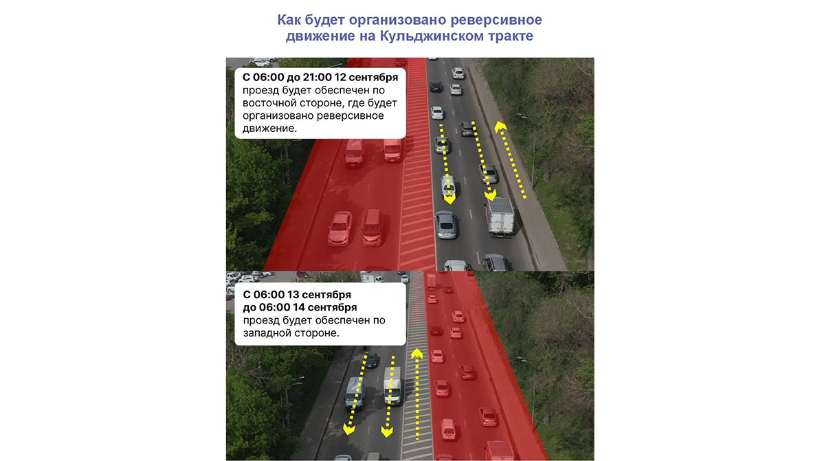Далее с 6:00 13 сентября до 6:00 14 сентября проезд откроют по западной стороне, где также организуют реверсивное движение.