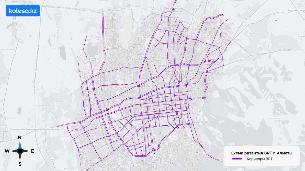 В данное время BRT в южной столице функционирует на улице Тимирязева, а 14 декабря автобусные коридоры официально запустили на Желтоксан. На очереди — BRT на Райымбека, закончить обустройство которой чиновники обещают в 2026 году.