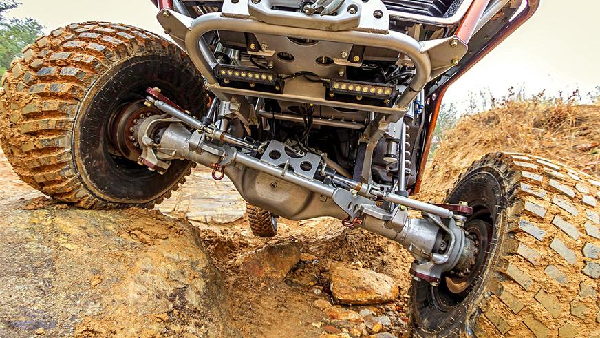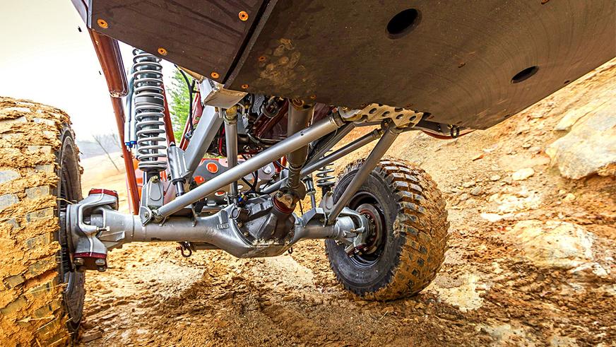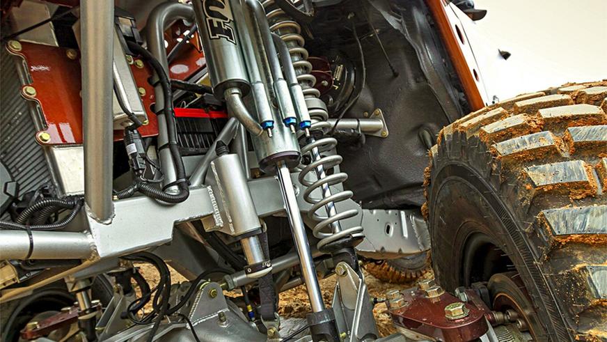 Для обеспечения грамотной развесовки тяжёлый мотор со всем навесом переехал за пассажирскую кабину, и в освободившееся подкапотное пространство вторглись длинноходные амортизаторы Fox с 18-дюймовыми койловерами и силовой поддержкой. Задняя ось «Химеры» сделана поворотной, что с учётом конструкции независимой подвески с дифференциалами AxleTech 4000 позволяет водителю машины забыть о дорогах как таковых, принимая за ограничение свободы лишь размер препятствий в метровой шкале. Способности гипервнедорожника при передвижении в условиях горной местности вы можете оценить на видео.