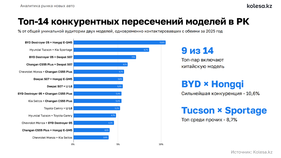 Процесс выбора нового автомобиля для каждого человека свой, но довольно привычный. Один покупатель изначально имеет конкретный вариант в уме и даже не рассматривает альтернативы. Другой может поглядывать на типичных конкурентов в рамках одного класса. Ну а третий будет оперировать только своим бюджетом — марка, тип кузова и прочее имеет значение вторичное. Аналитики Kolesa.kz подсчитали, между какими марками и моделями чаще всего выбирают пользователи платформы, и поделились эксклюзивными данными на конференции «Новые авто» в Алматы для профессионалов авторынка.