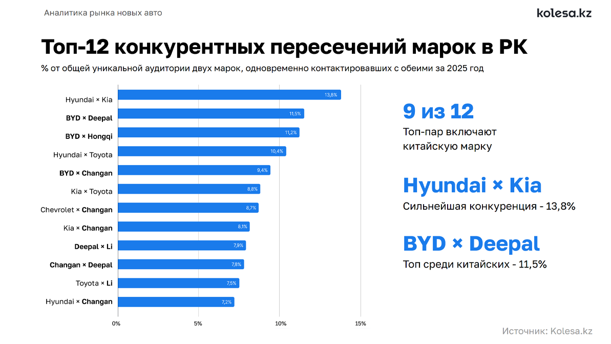 Наиболее часто в условиях казахстанского авторынка пересекаются потенциальные покупатели Hyundai и Kia, что в целом неудивительно, учитывая их родственные связи и лидерство на официальном рынке. По данным Kolesa.kz, 13.8 % общей аудитории этих двух марок на сайте присматривались к моделям обеих.