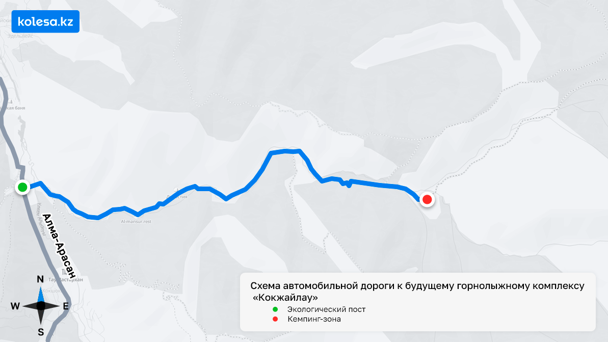 Дорога будет начинаться от экологического поста по пути на Большое Алматинское озеро и вдоль реки Казачка, через посёлок Кокшокы, а также комплексы «Кумбель» и «Энергетик», выходить к существующей сегодня