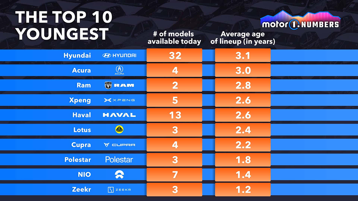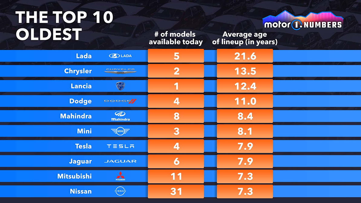 Издание Motor1 на основе собственного анализа заявило, что старейшей модельной линейкой на планете обладает марка Lada. Средний возраст моделей лидера российского автопрома — 21.6 года. Наиболее свежие модели на данный момент выпускают компании из Китая.