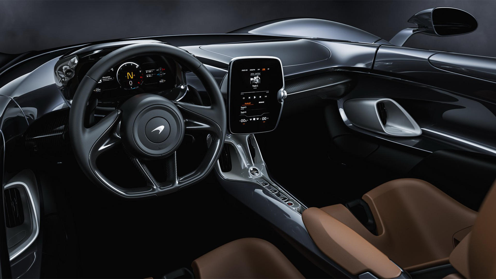 Салон, по сути, гоночной машины нельзя назвать аскетичным, поскольку там даже имеется аудиосистема (опционально, но клиент может поставить её, не заплатив ни пенни) и центральный сенсорный экран диагональю восемь дюймов, на который выводятся данные навигации, комплекса телеметрии, картинка с камеры заднего вида и настройки климатической установки. По углам цифровой приборной панели вынесены кнопки переключения режимов движения и отключения стабилизации.