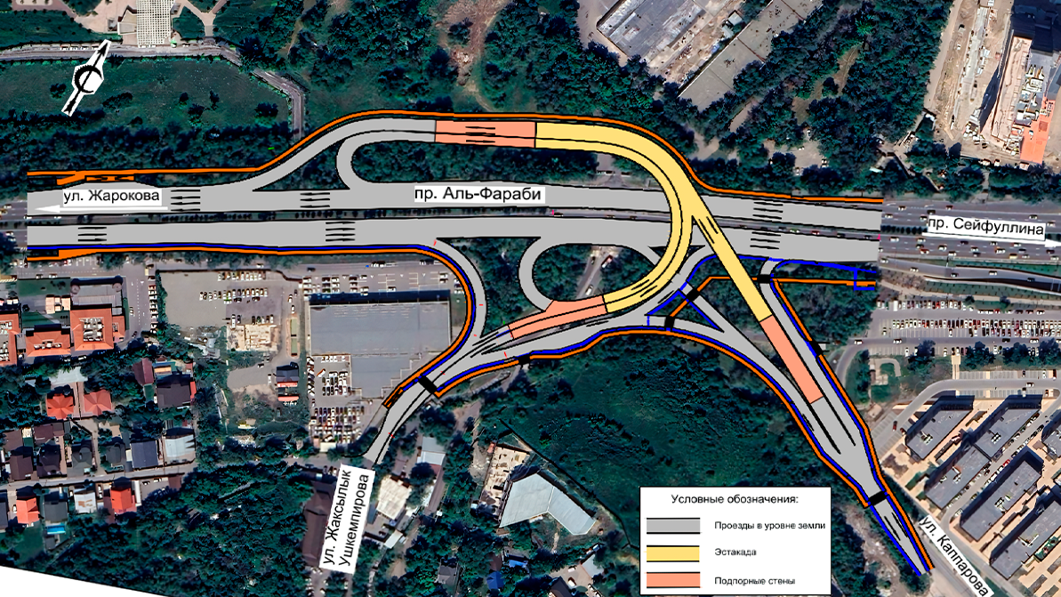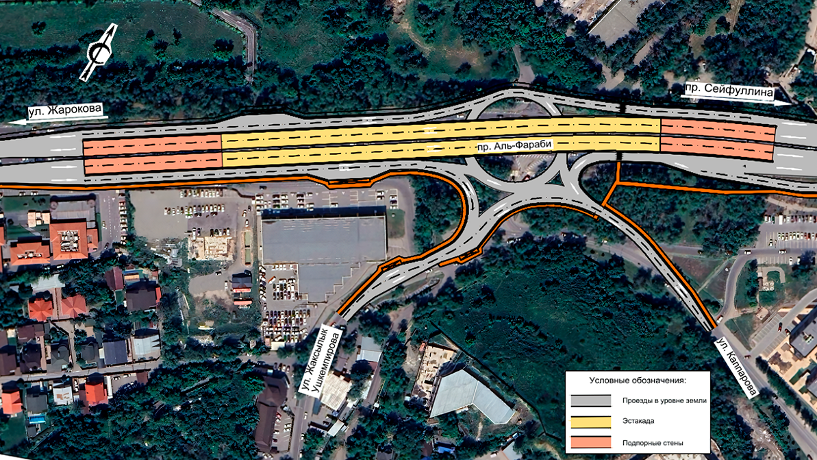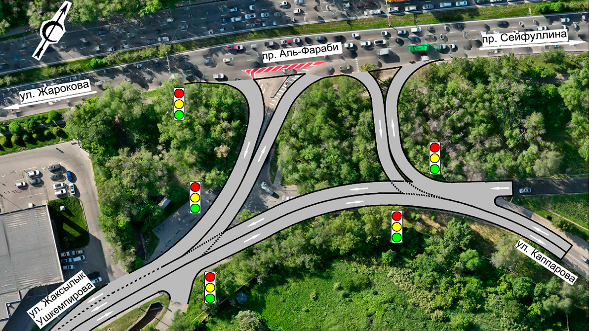 1. Обустройство кольца южнее Аль-Фараби с поворотными съездами с/на Ушкемпирова и Каппарова. Из заявленных преимуществ — малая площадь территории объекта, наименьший снос зелёных насаждений, обеспечение правых поворотов с/на Аль-Фараби и левого с Каппарова на Ушкемпирова. Из недостатков — отсутствие левого поворота с Аль-Фараби, если двигаться в западном направлении, для этого всё так же придётся разворачиваться на Жарокова. И в целом ограниченная пропускная способность развязки такого плана без перспективы её увеличения за пределами расчётного срока.