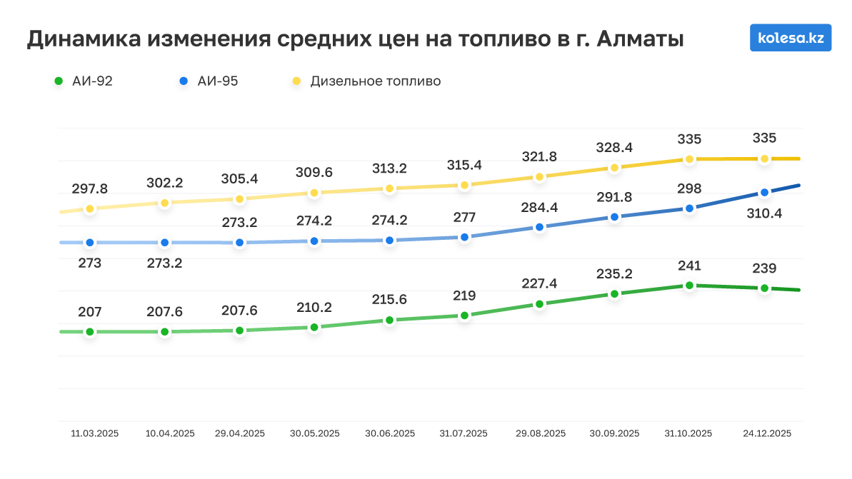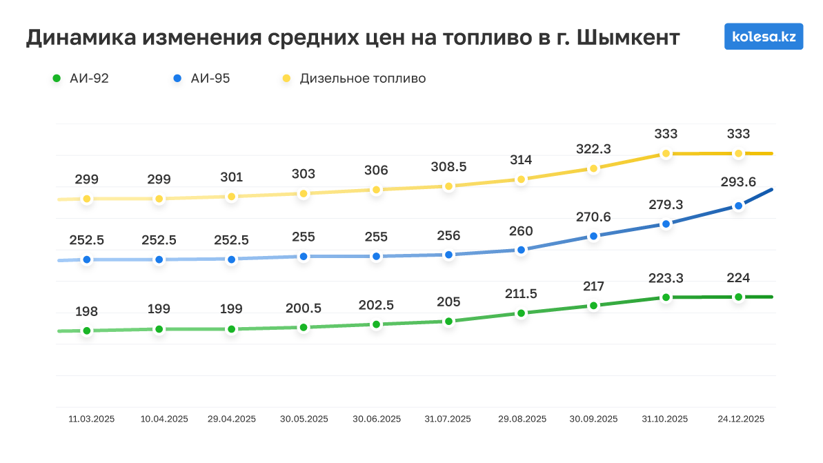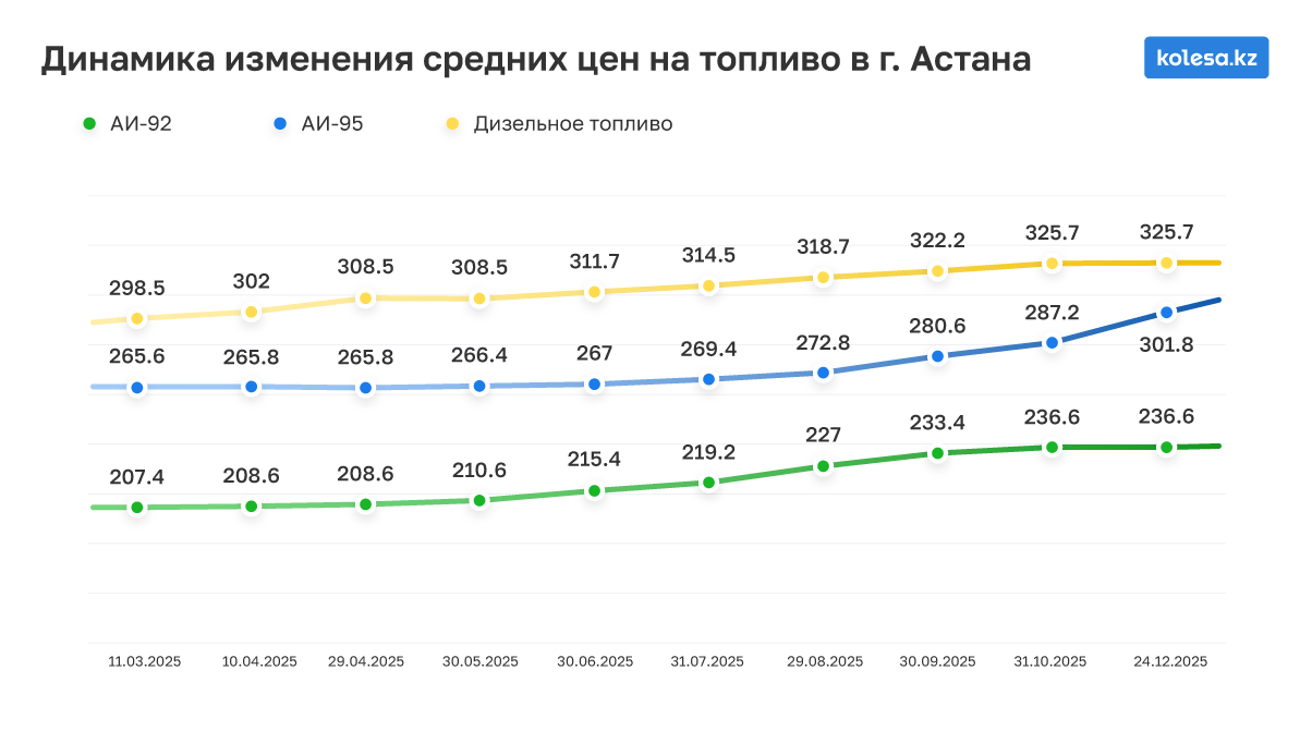 В сентябре на заправках южной столицы уже красовались ценники от 235 до 236 тенге за АИ-92 и от 327 до 328 тенге за дизель. В Астане в то же время просили по 231–235 тенге за 92-й и 321–323 тенге за ДТ. В Шымкенте топливо всё ещё заметно доступнее — от 215 до 219 тенге за АИ-92 и 318–328 тенге за солярку.