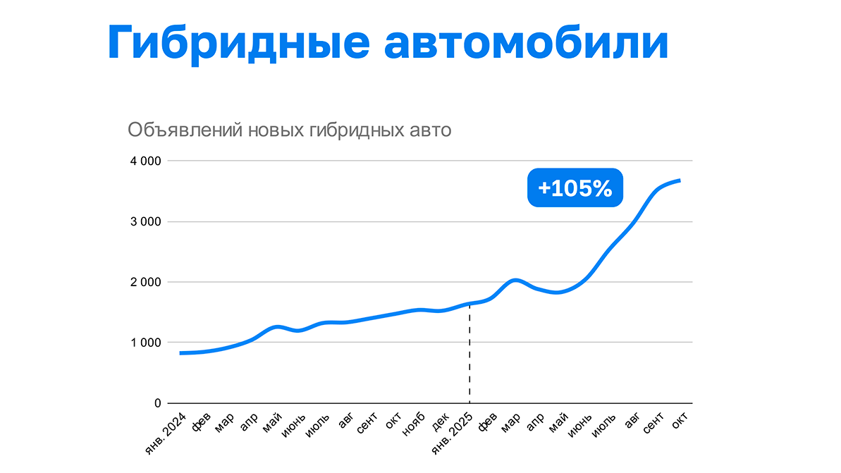 Стоит отметить, что из всех моделей, представленных в двадцатке лидеров спроса 2025 года, почти половина имеет гибридные модификации либо вовсе существует только в бензин-электрической версии. И по данным Kolesa.kz, количество объявлений о продаже новых гибридов с начала 2024 года выросло на 105 %. Доля таких предложений в общей массе сейчас достигает 18.3 %. Уровень спроса за аналогичный период увеличился на 133 %.