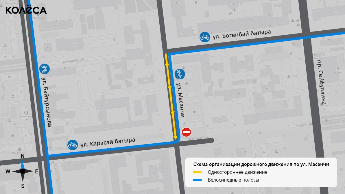 Односторонним, с движением автомобилей в южном направлении, сделали кусок Масанчи от Карасай батыра до Богенбай батыра. При этом по половине проезжей части, ранее предназначенной для следования в северном направлении, пустили велосипедистов. Одновременно по Богенбай батыра, от Кунаева до Масанчи, а также по Карасай батыра, от Масанчи до Байтурсынова, разметили новые велодорожки.