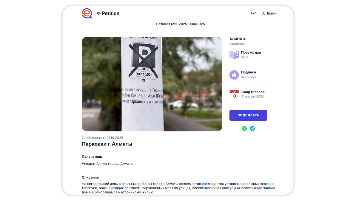 Авторы петиции заявили, что решения о введении платных парковок принимаются без проведения обязательных общественных слушаний, что противоречит принципам гласности и участия граждан в управлении делами местного сообщества, закреплённым в законодательстве Республики Казахстан, и предложили: