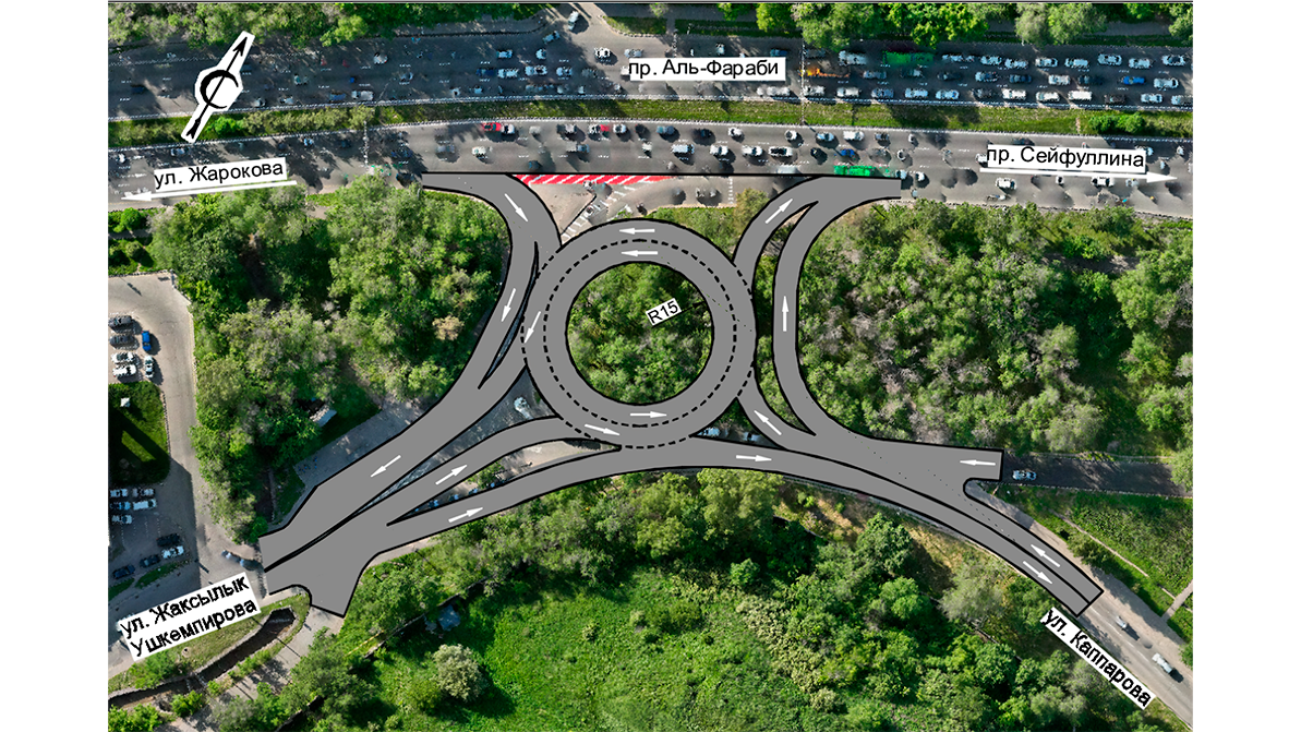 Напомним, кольцо предлагается обустроить южнее Аль-Фараби с поворотными съездами с/на улицы Ушкемпирова и Каппарова. Преимущества данного варианта — малая площадь территории объекта, наименьший снос зелёных насаждений, обеспечение правых поворотов с/на Аль-Фараби и левого с Каппарова на Ушкемпирова. Главный недостаток — отсутствие левого поворота с Аль-Фараби при движении в западном направлении. Для совершения манёвра водителям по-прежнему придётся разворачиваться на Жарокова. При этом пропускная способность развязки также будет ограничена.