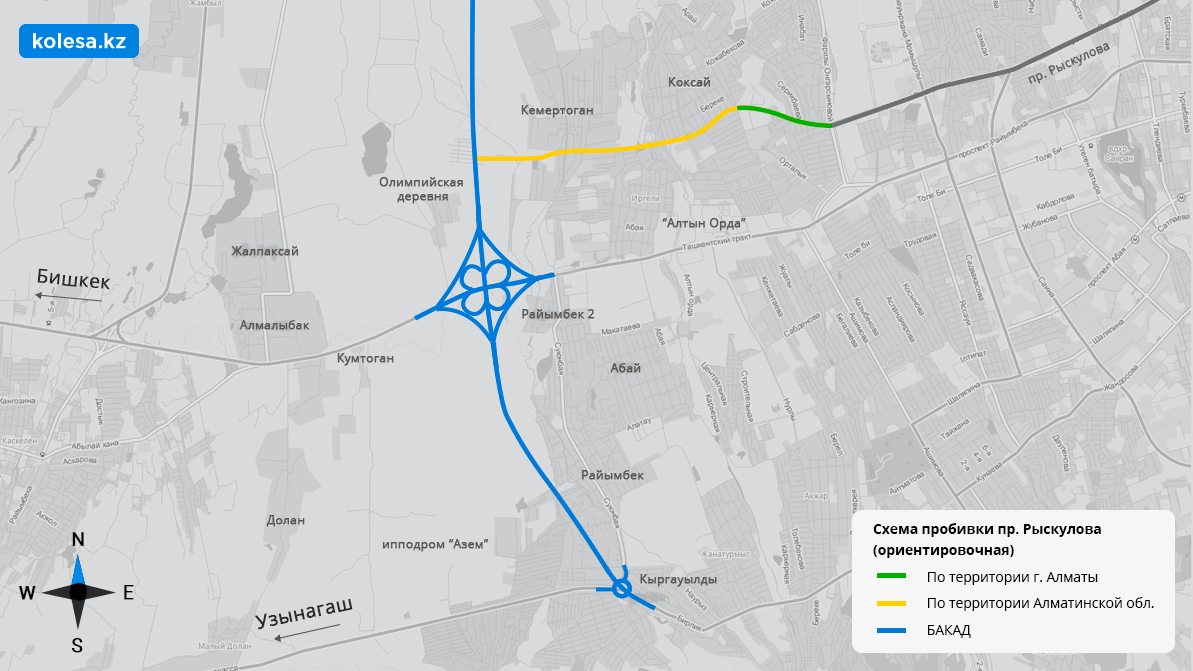 По предварительным данным, в южной столице проспект Рыскулова пройдёт через микрорайоны Алгабас и Теректы, в сторону областных посёлков Коксай, Иргели и Кемертоган. Но алматинские дорожники пока ждут окончательного утверждения генерального плана развития города и только после этого займутся разработкой ПСД, выкупом земель и пробивкой.