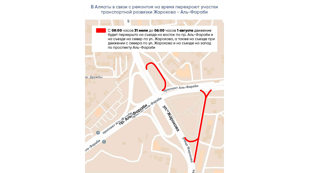 Проезд авто ограничили сегодня, 31 июля, с 8:00 до 6:00 1 августа на съезде с Аль-Фараби на Жарокова при движении в восточном направлении с последующим поворотом на север и съезде с Жарокова на проспект при движении в сторону центра города, а также на съезде при движении вниз по Жарокова с выездом на Аль-Фараби в западном направлении.