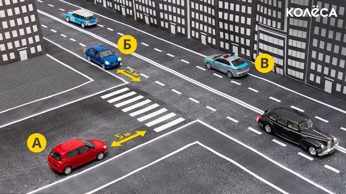Але, редакция «Колеса» , вы хоть правила читайте ,если не знаете их сами ,перед тем как статью писать. Пункт правил 12.4.7 гласит следующее: на пересечении проезжих частей дорог и ближе ТРИДЦАТИ метров от края пересекаемой проезжей части дороги… А не как у вас 5 м. Следовательно ,вариант 3 правильный и авто Б нарушает