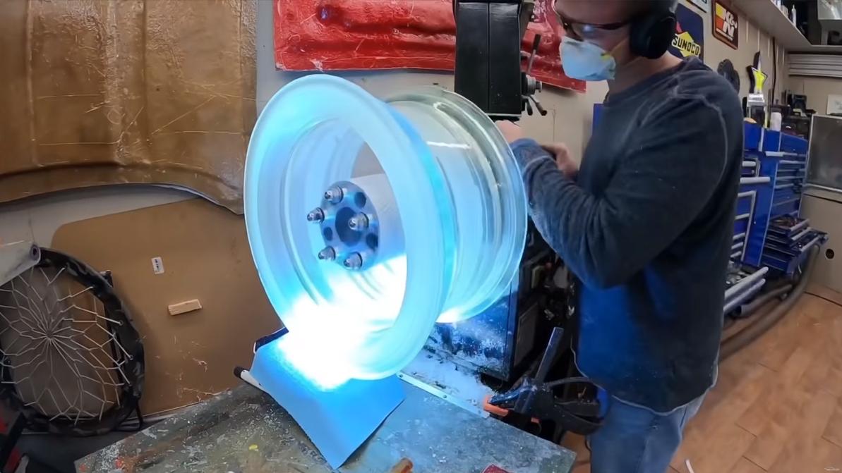 Если провести аналогию между миром автомобильных колёс и человеческой обувью, то блогер-автолюбитель из Мичигана сотворил «хрустальную туфельку» для Золушки. С учётом хрупкости материала составной (обод и кругляш отлиты отдельно) диск из эпоксидной смолы сделан бесспицевым, со ступицей, прикрученной к центру болтами. По контуру диска закреплена светодиодная полоска, переливающаяся огнями во время движения.
