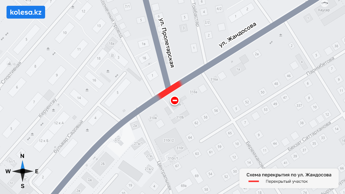 Участок Жандосова на пересечении с улицей Пролетарской перекроют в ночь с 29 на 30 ноября, с 00:00 до 23:00 1 декабря, то есть в выходные: в субботу и воскресенье.