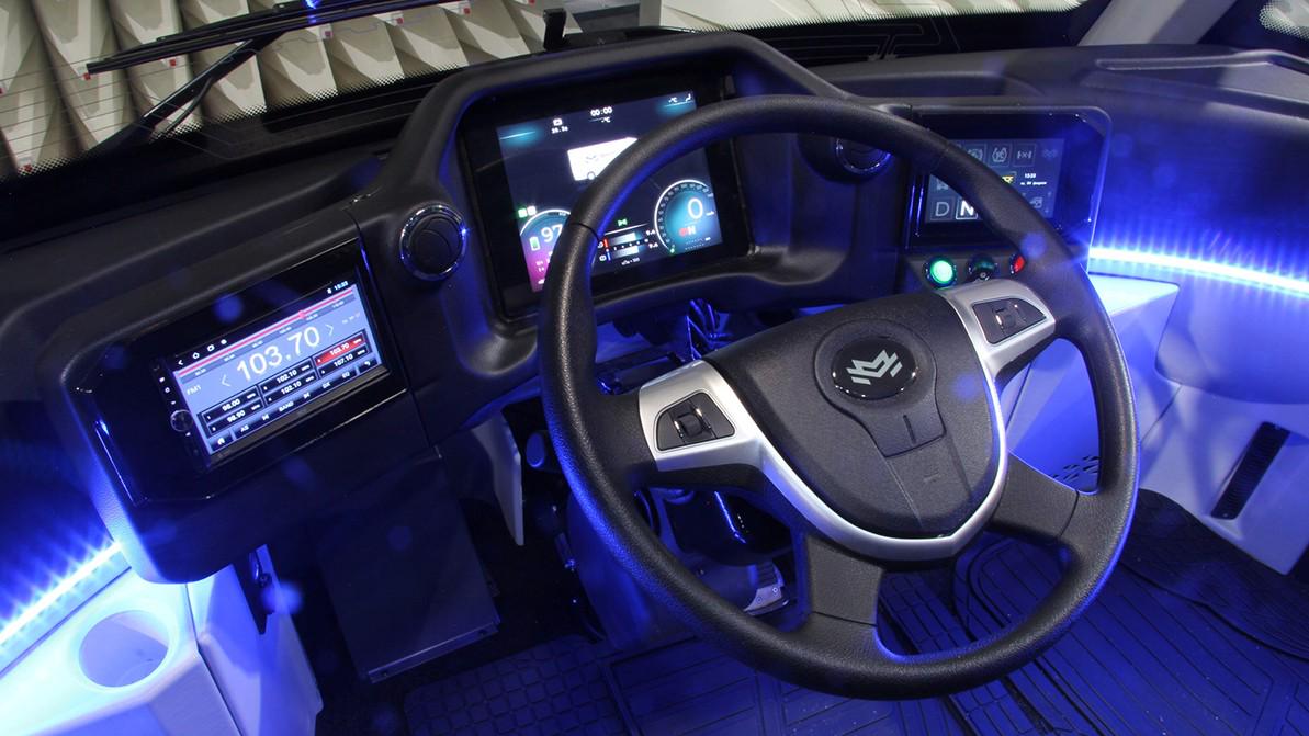 Внутри внимание сразу привлекает необычная компоновка кабины. Водитель тут сидит по центру, а позади него могут разместиться два пассажира. Подобная схема сделана для того, чтобы Vitovt Truck Electro Prime можно было без переделок использовать в странах с лево- и правосторонним движением. Хотя создаётся впечатление, что в проектировании кабины принимали участие инженеры из трамвайного цеха.