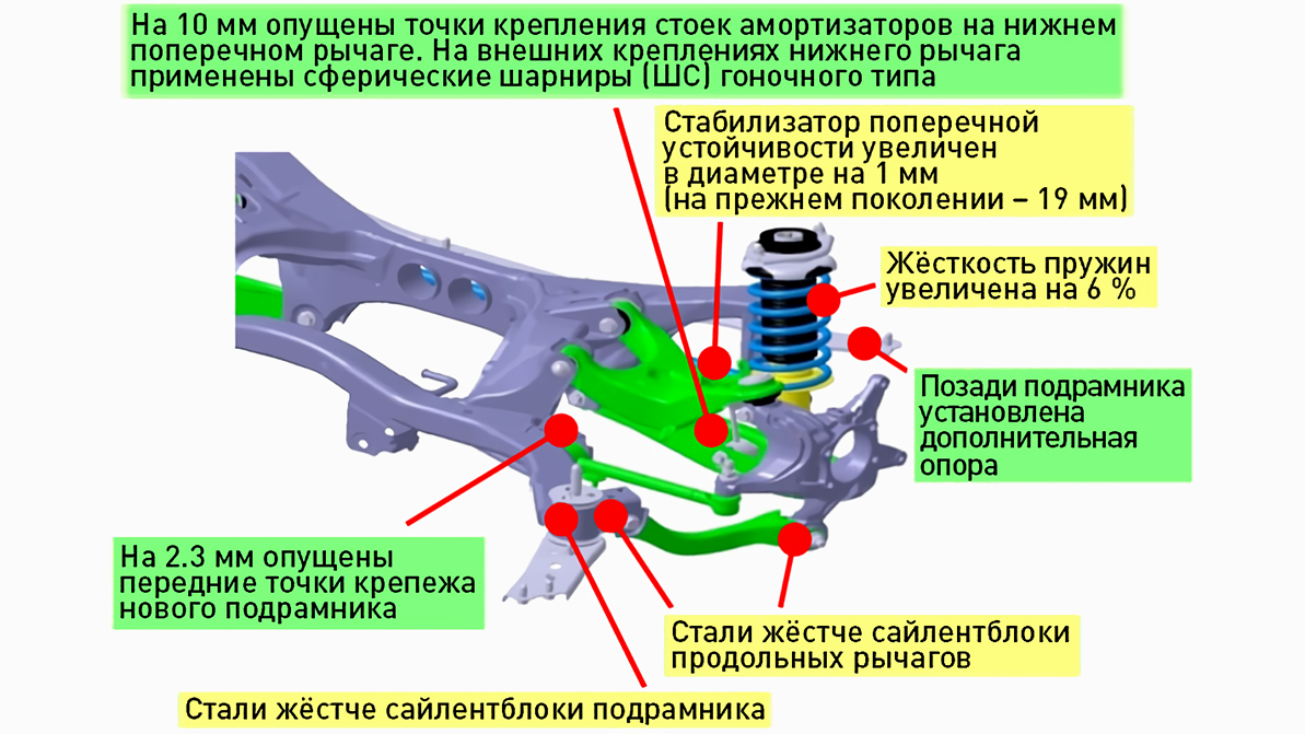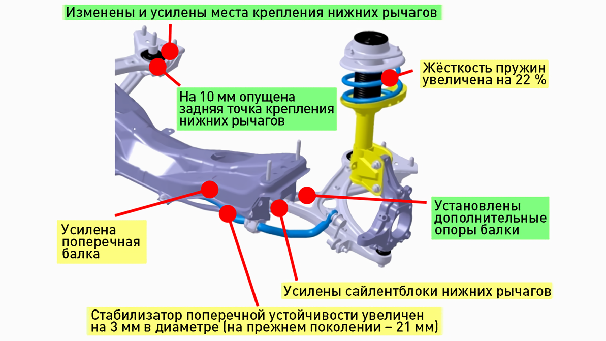 Подвеска Subaru WRX STI полностью независимая: спереди стойки McPherson, сзади многорычажная. По сравнению с прошлой Impreza WRX STI ходовая пережила массу изменений. По большому счёту, они относятся к усилению, но есть доработки и в конструкции.