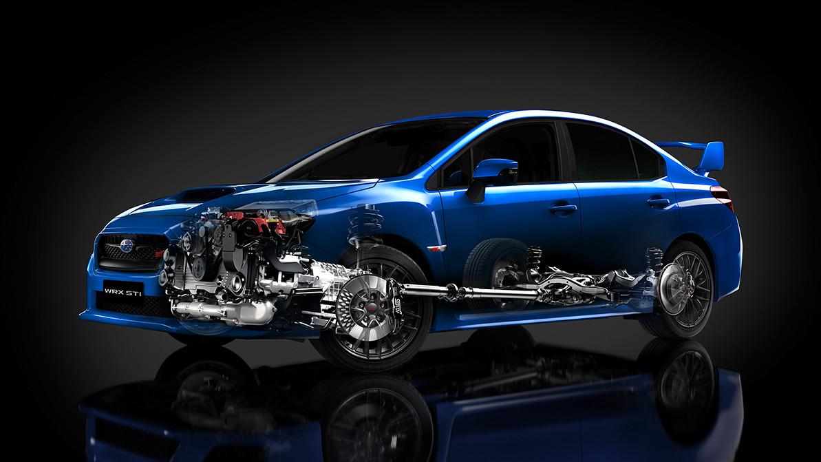 Несмотря на то что у Subaru пошли в серию моноприводные автомобили (Impreza с передним приводом, купе BRZ с задним), трансмиссия Subaru WRX STI, как и прежде, полноприводная. Распределение момента происходит через межосевой дифференциал, где по умолчанию на заднюю ось передаётся больше момента (59 %), а на переднюю — меньше (41 %). Центральный диф, управляемый за счёт двух LSD — механической и с электромагнитным приводом — посредством системы DCCD, в которой заложено 3 автоматических режима и 6 мануальных:
